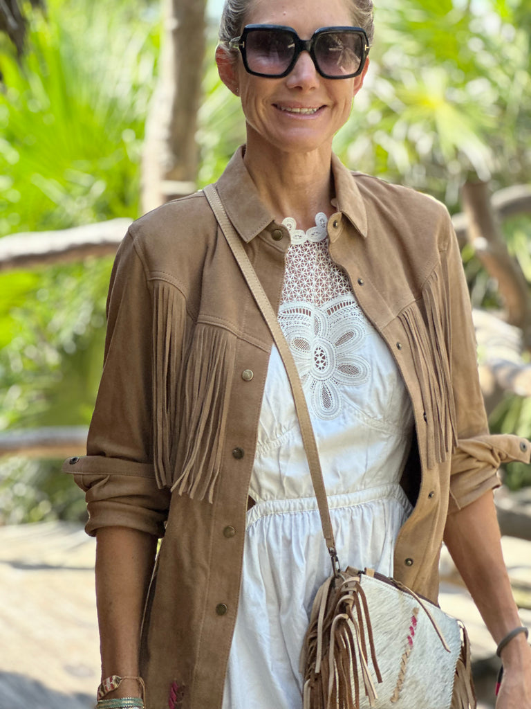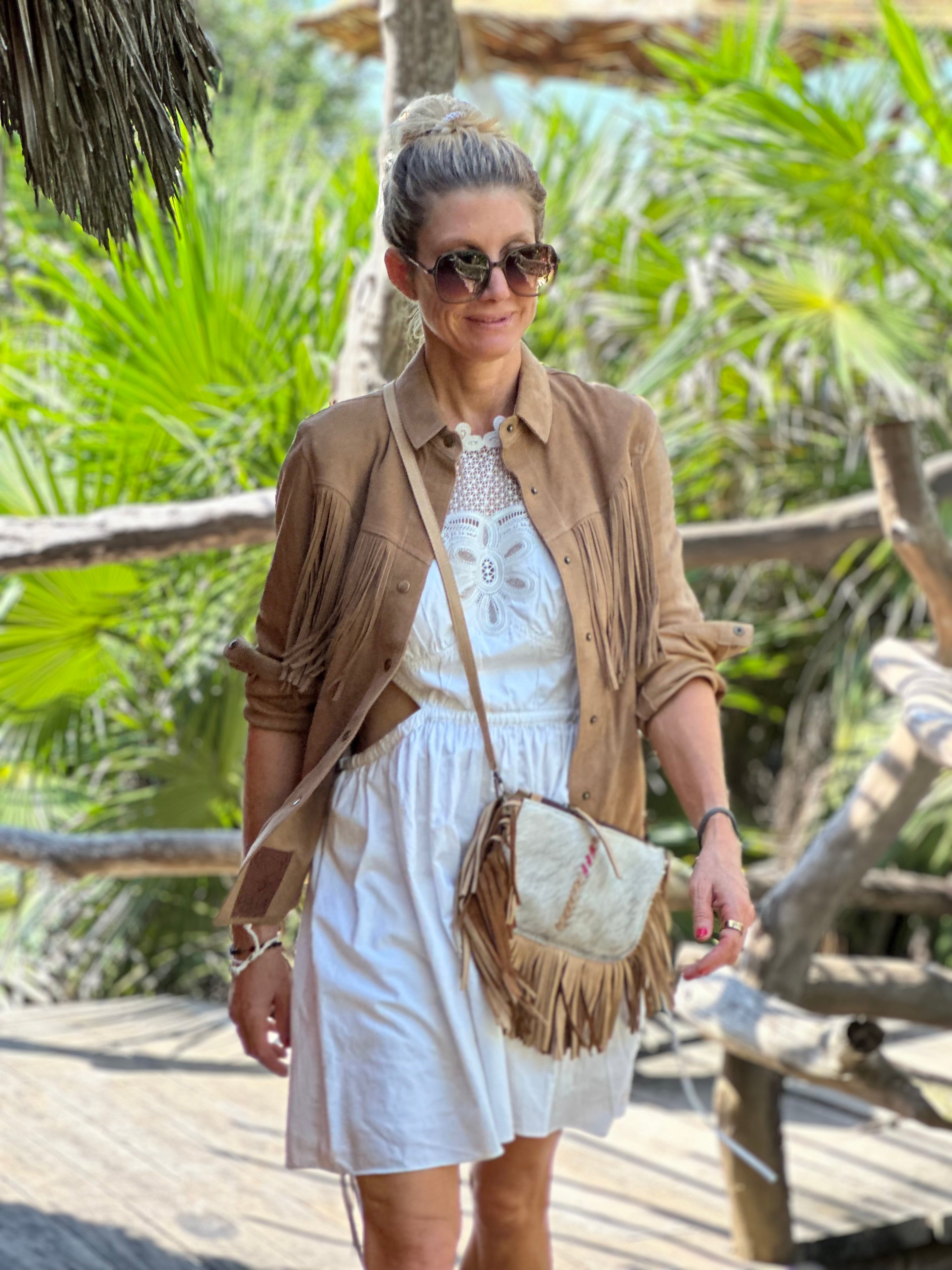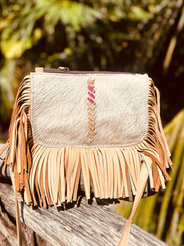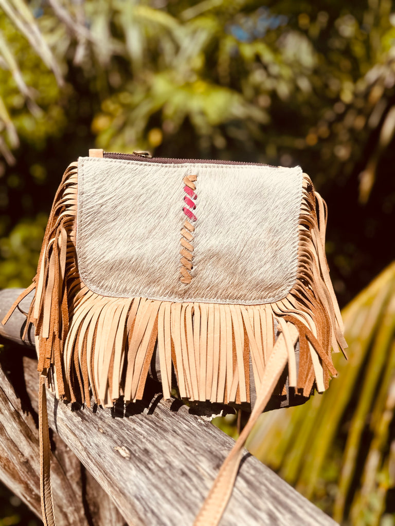 Your new everyday essential. Handcrafted in our signature white hide, this small crossbody white hide bag is finished with the softest light beige goat suede fringes that move with you. Perfectly sized to fit just what you need — wallet, sunglasses, and a touch of Pata spirit.