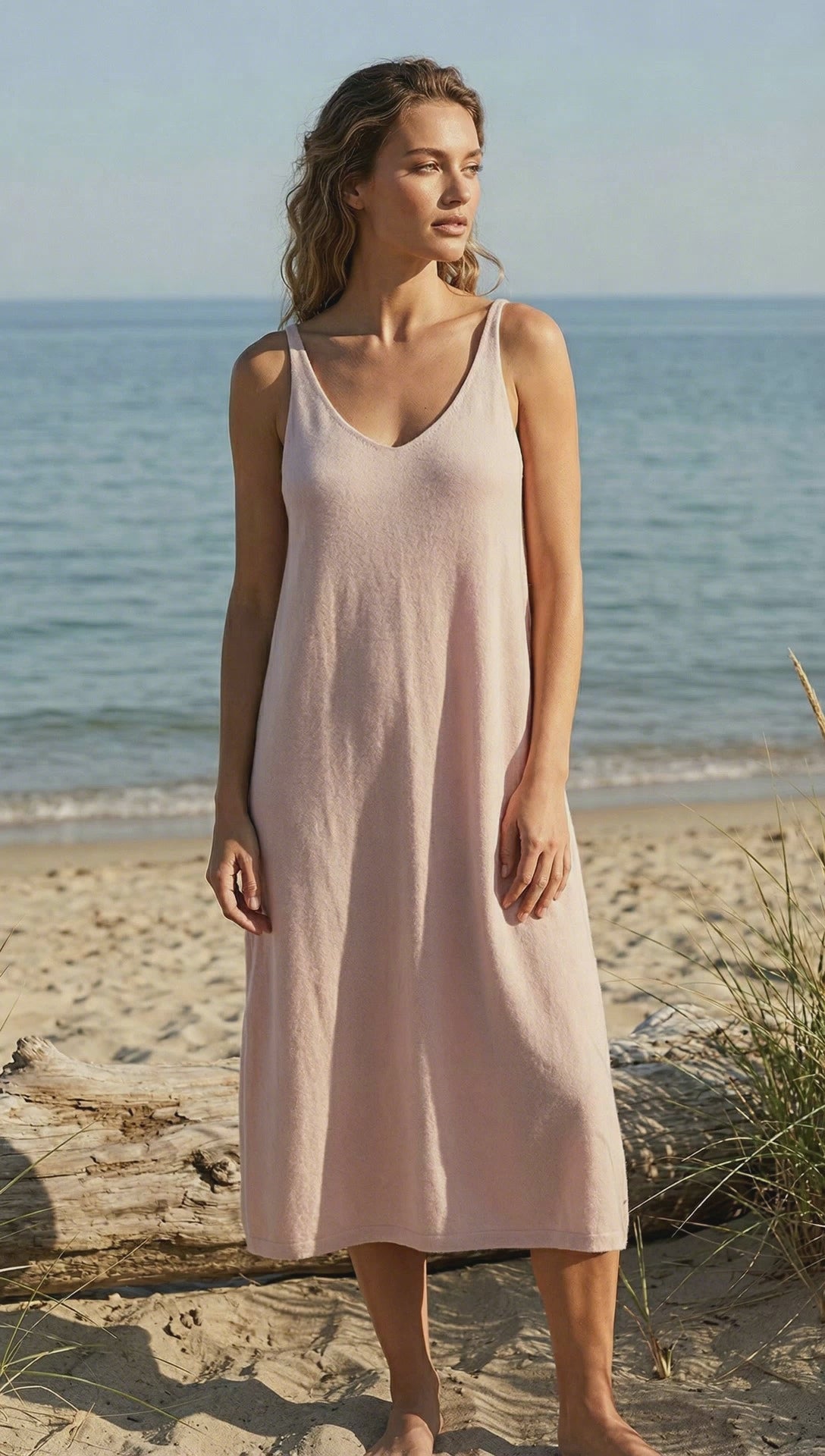 Our Cashmere Twin Set is crafted from 100% Mongolian cashmere in a soft, feminine blush. This versatile set includes a V-neck cashmere dress, perfect for warm summer days or worn effortlessly over a swimsuit, paired with our cropped cashmere shirt for an elevated layered look.