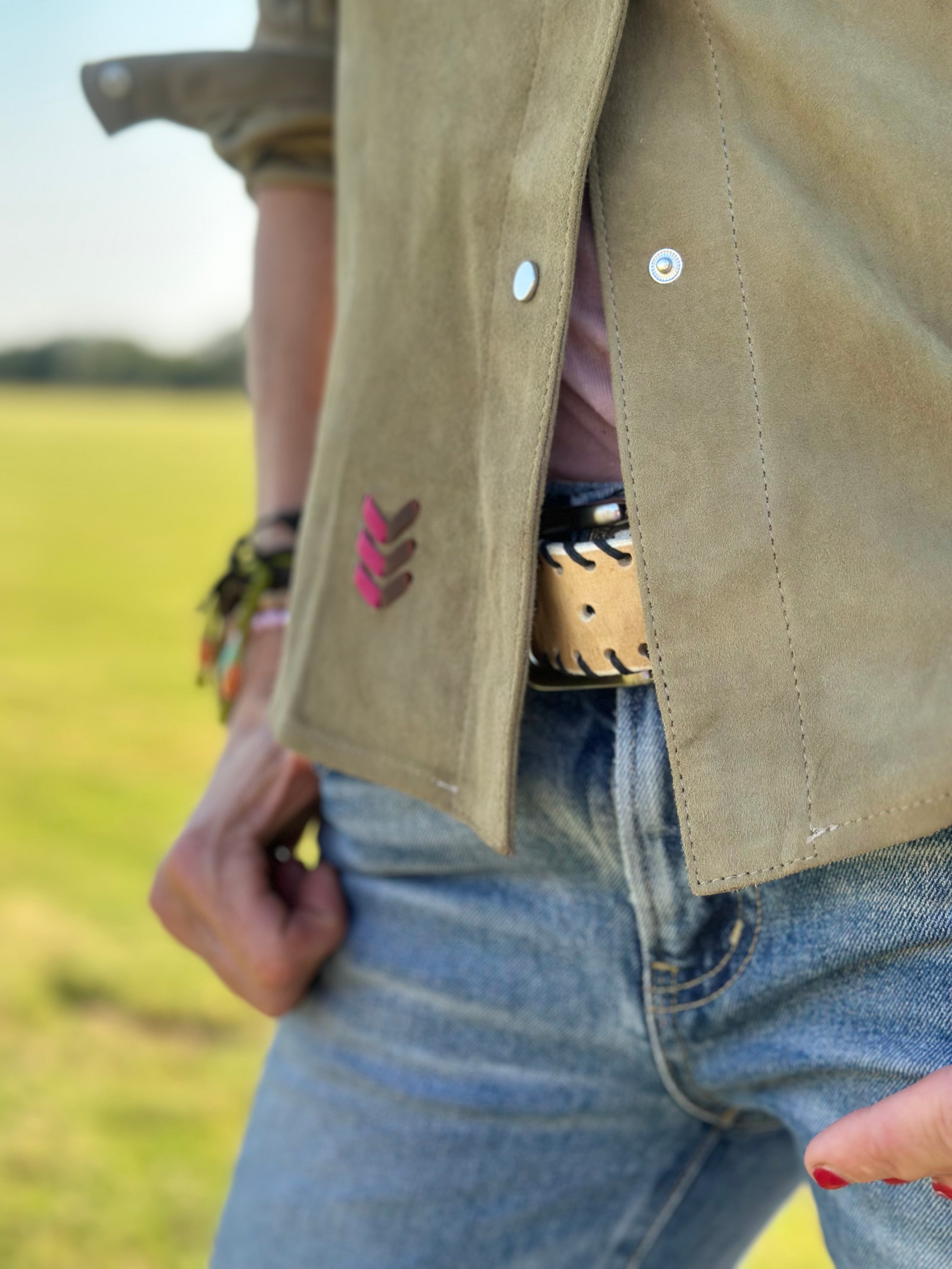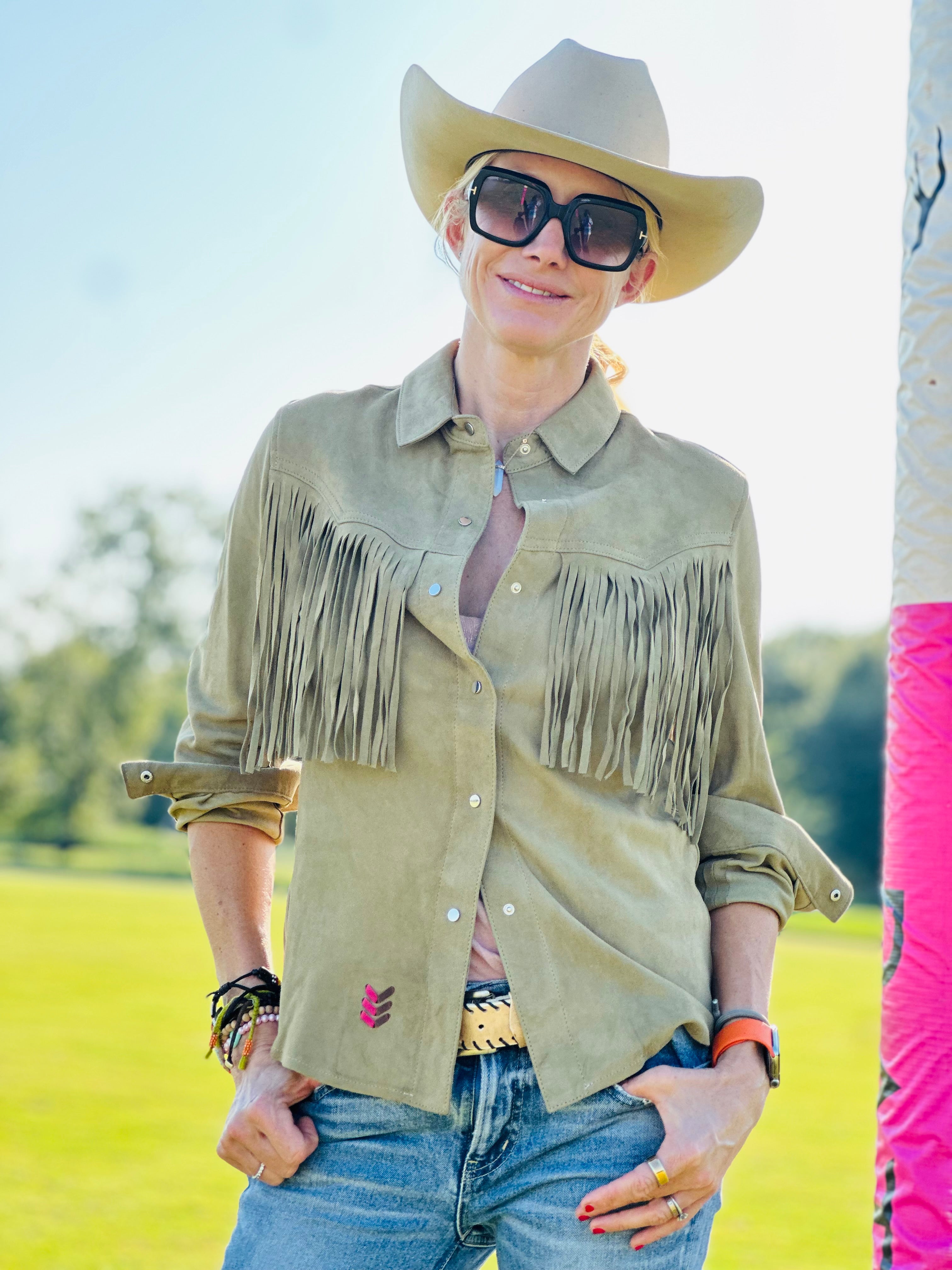 This isn’t just a shirt—it’s a statement. Crafted from buttery-soft goat suede, this piece blends western flair with everyday sophistication. Fringed detailing adds movement and edge, while the tailored silhouette keeps it polished and wearable.
