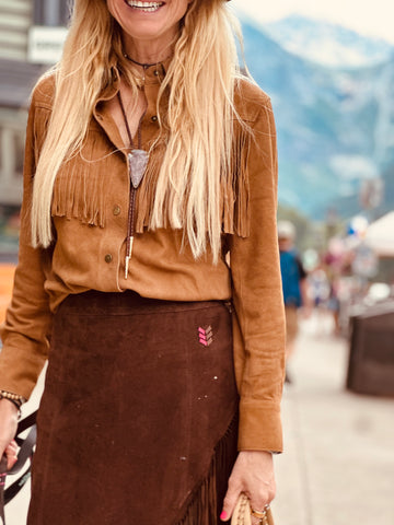 This isn’t just a shirt—it’s a statement. Crafted from buttery-soft goat suede, this piece blends western flair with everyday sophistication. Fringed detailing adds movement and edge, while the tailored silhouette keeps it polished and wearable.