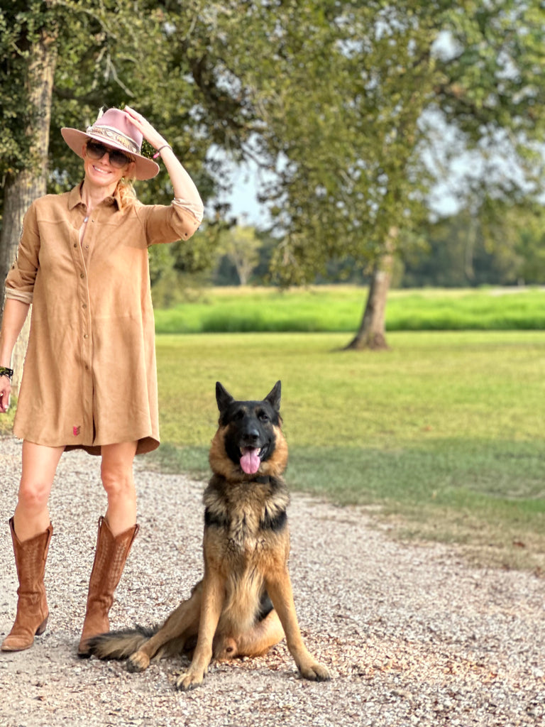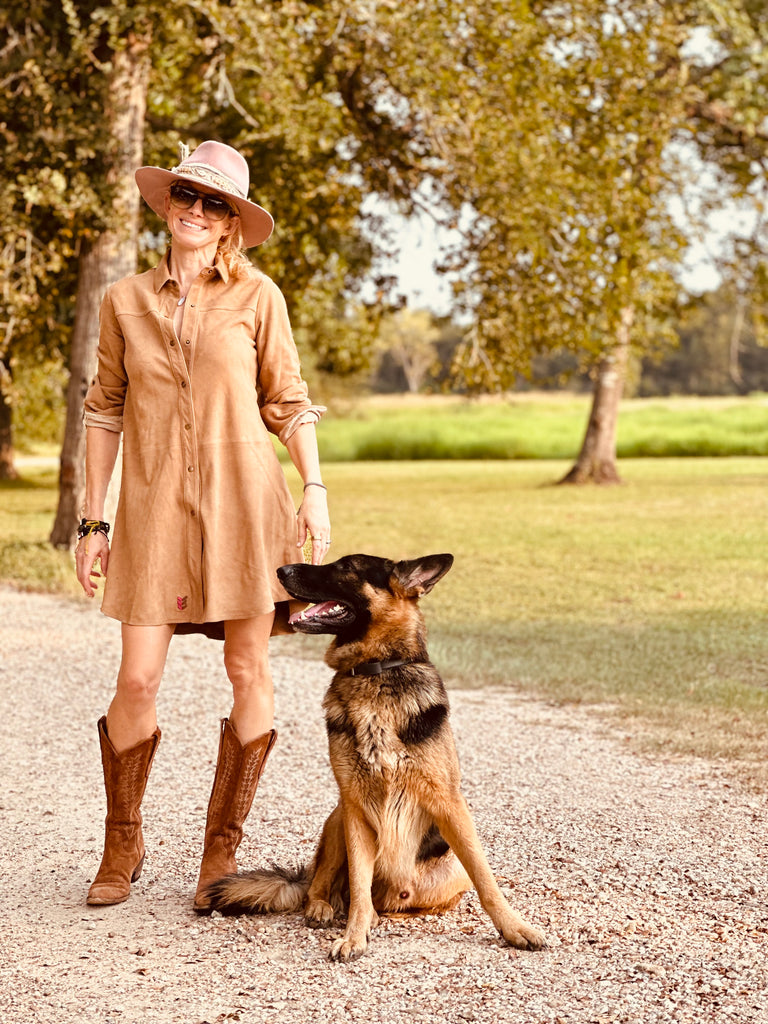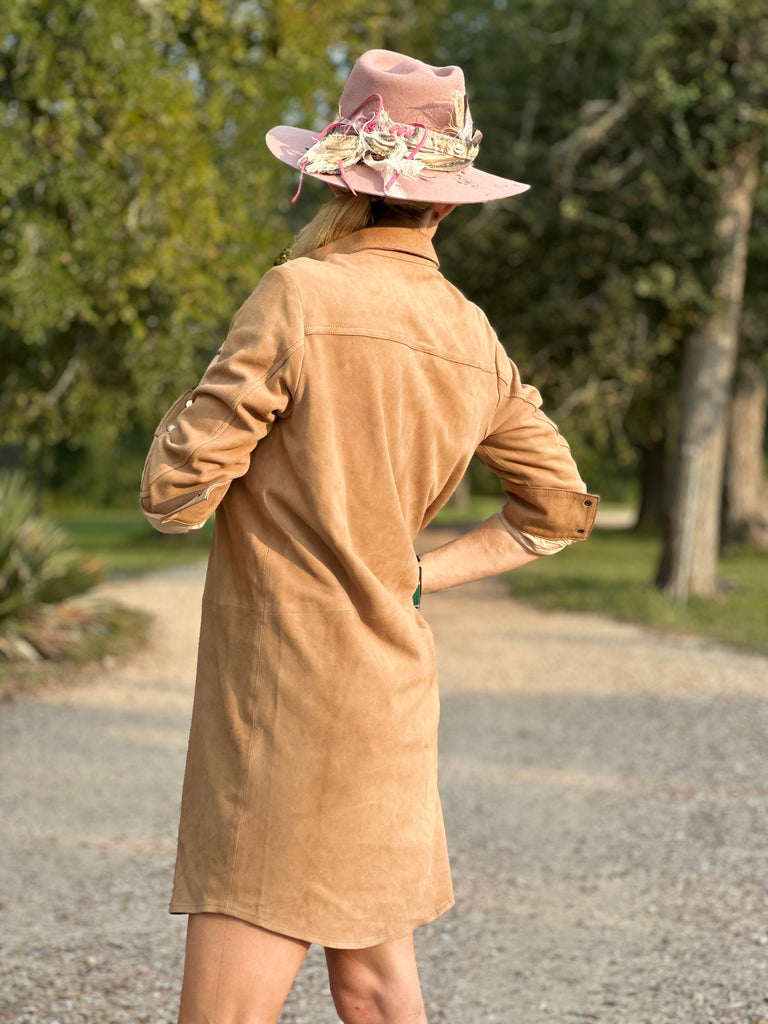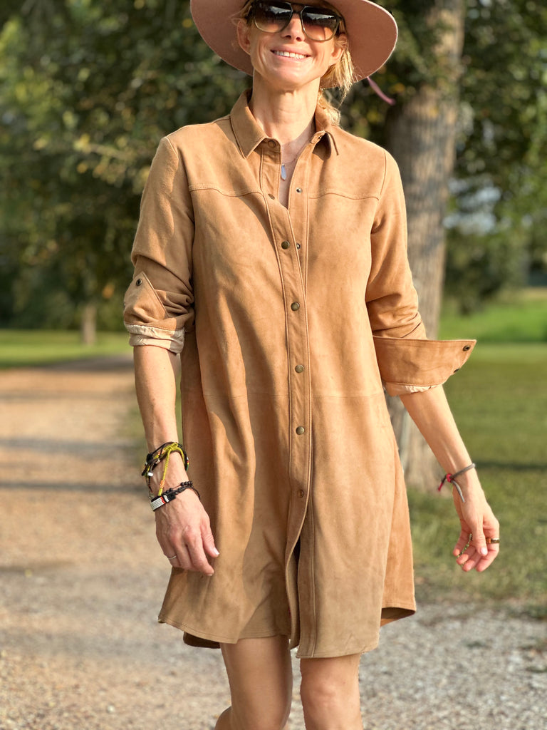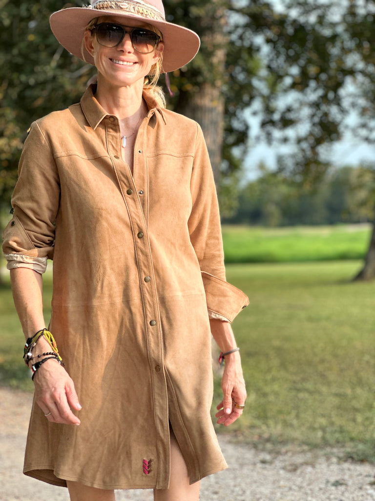 Effortlessly chic and endlessly soft, this above-the-knee dress is handcrafted from our signature goat suede. Designed in a shirt-style silhouette, it blends relaxed sophistication with a touch of western edge.